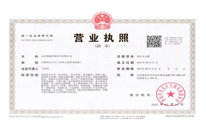山東博通環(huán)保技術有限公司是一家專業(yè)從事環(huán)保、安全、消防的多元化技術服務公司,公司致力于打造專業(yè)的技術服務團隊,立足青島,輻射山東,服務范圍涵蓋:環(huán)保技術開發(fā)、技術轉讓、技術咨詢、技術服務;環(huán)保工程;消防技術咨詢;消防設施檢測;消防安全評估;消防設施維護保養(yǎng);環(huán)境應急預案咨詢;安全生產(chǎn)標準化咨詢;場地環(huán)境調查報告編制,土壤與地下水環(huán)境調查及風險評估,水土保持方案編制,水土保持過程監(jiān)測,水土保持驗收工程,排污許可申報代理,清潔生產(chǎn)審核;批發(fā)零售:環(huán)保設備、機械設備與配件、消防設備、儀器儀表、五金建材、化學試劑(不含危險品)。公司具有“建設手續(xù)一站式辦理,安環(huán)問題一條龍解決”的獨特優(yōu)勢,可為客戶提供高效、優(yōu)質的安全、環(huán)保、消防管家技術服務。